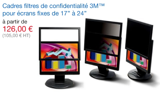 Les filtres de confidentialité 3M™ gardent privées vos informations confidentielles. Seules les personnes placées directement devant le moniteur voient l'image qui s'affiche, tandis que celles situées sur les côtés ne voient qu'un écran obscurci.